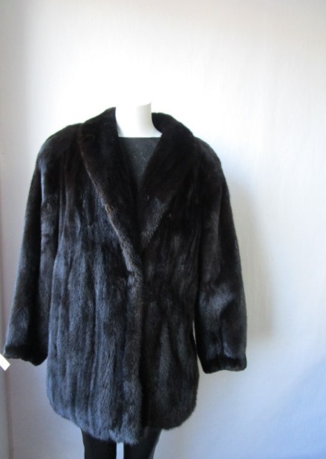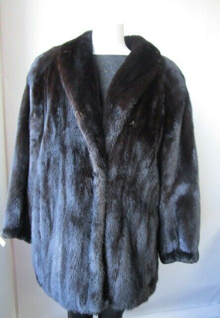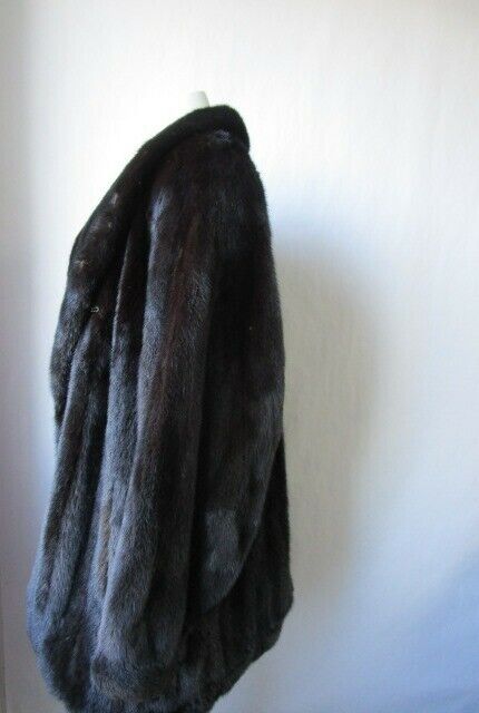 Natural (Brownish Black) Dark Ranch mink fur coat for women. Full top quality Canadian mink fur pelts, warm mink fur collar, front furrier closures, side slit pockets and satin lining complete the look of the this beautiful fur coat. Fur and lining in mint plus condition. Cleaned and glazed.