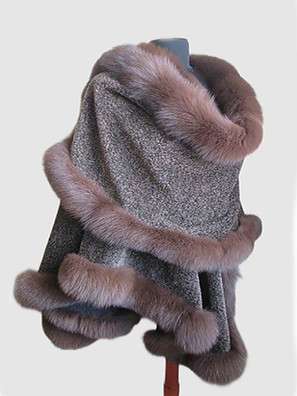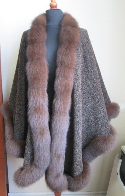 Women's Black Cashmere Wool Wrap Cape with Hood and Fox Fur Trim