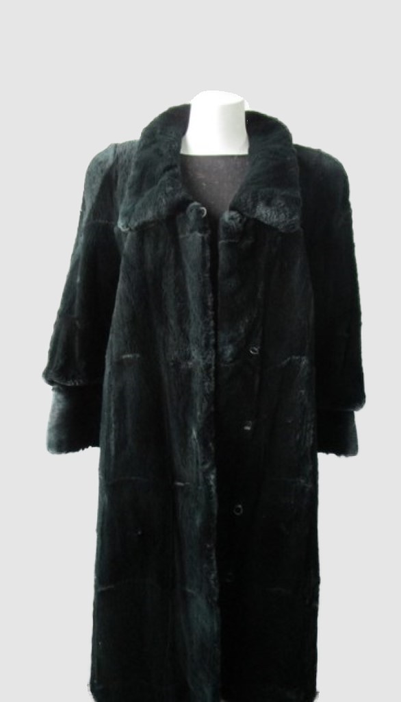 Superbly Soft and lightweight green sheared muskrat fur coat for ladies. Shawl style fur collar, side slit pockets, durable furrier / button closures and satin lining complete the look of this beautiful muskrat fur coat. Fur and lining in excellent condition. Cleaned and glazed.