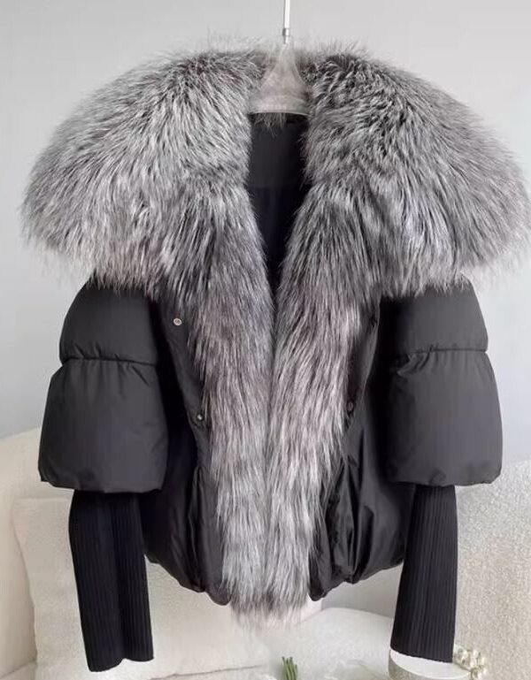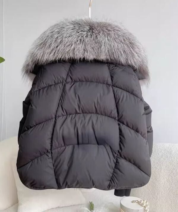 Women's Winter Down Jacket Coat Silver Fox Fur Collar and Trim Black