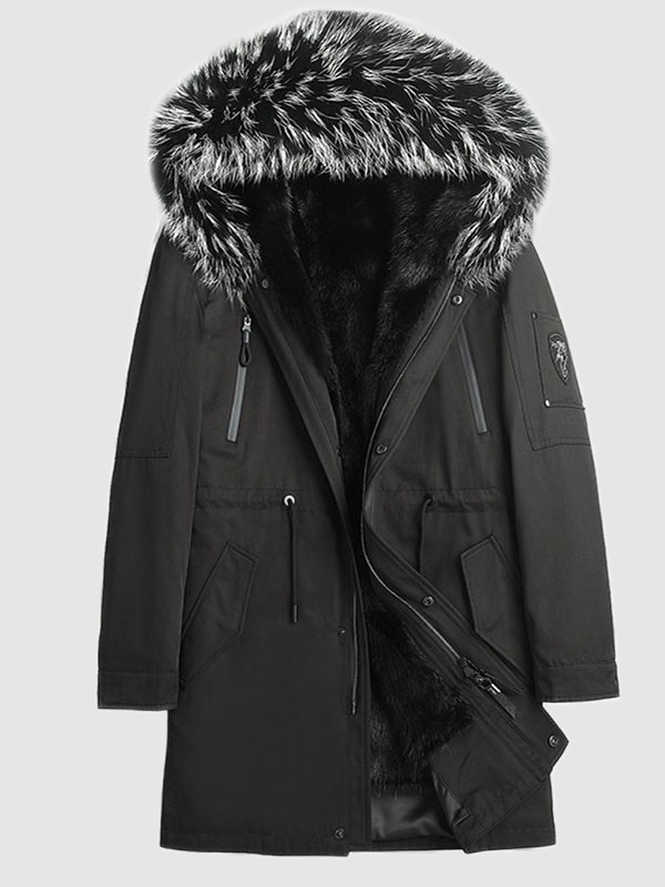 Men's Black Winter Jacket Parka Coat Jacket Mink Fur Lining HOOD