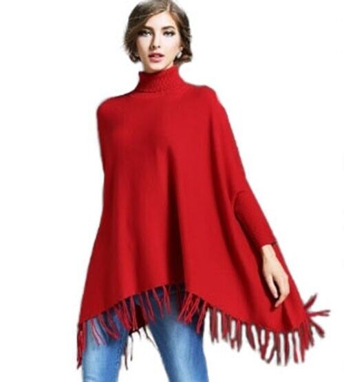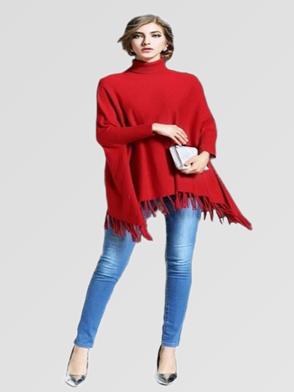 Women's Red 100% Wool Sweater Poncho with Sleeves