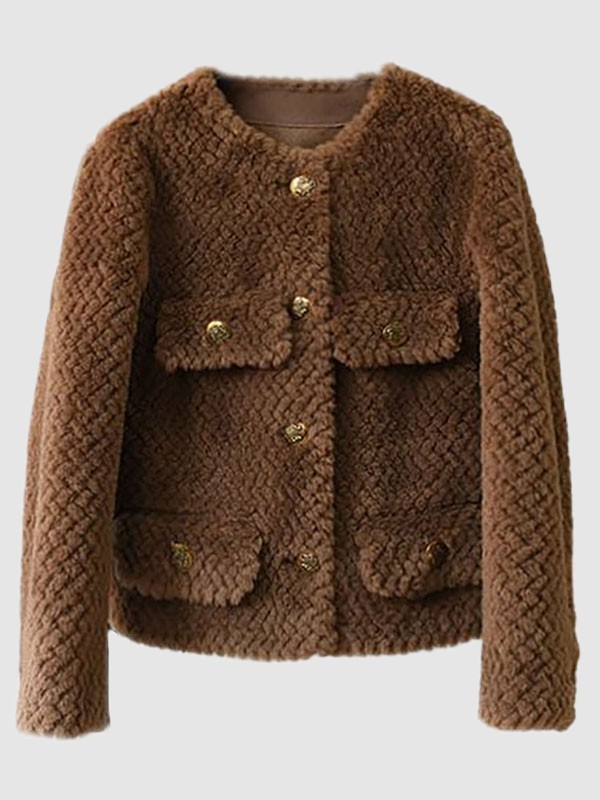 Women's New Camel / Checkered Wool Cape Shawl with Detachable Fox Fur Collar