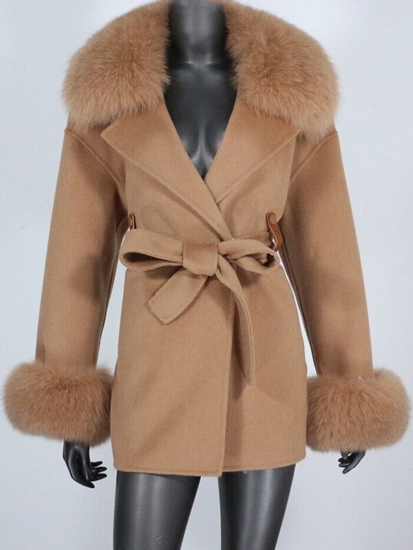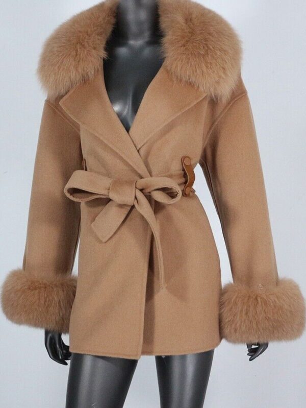Women's Oatmeal Beige Cashmere Wool Wrap Cape with Fox Fur with HOOD