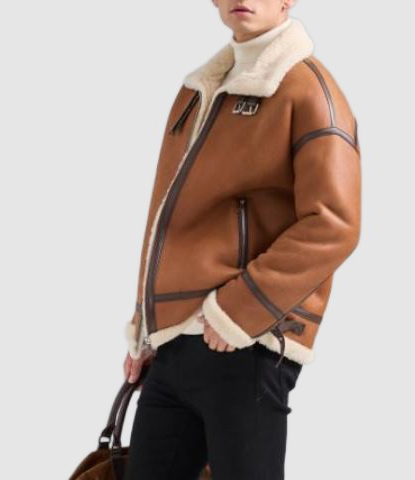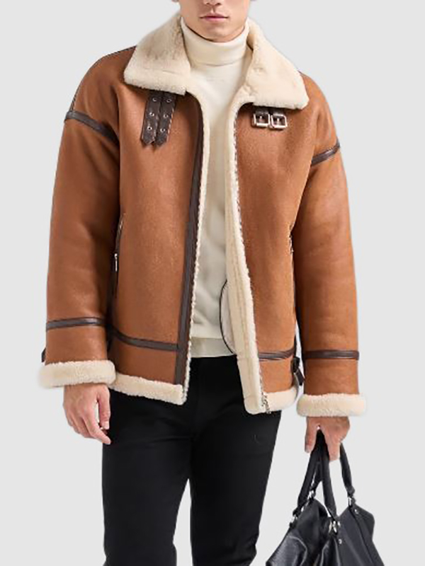 Men's Caramel Brown Leather Shearling Jacket Coat Sheepskin Fur Lining Aviator