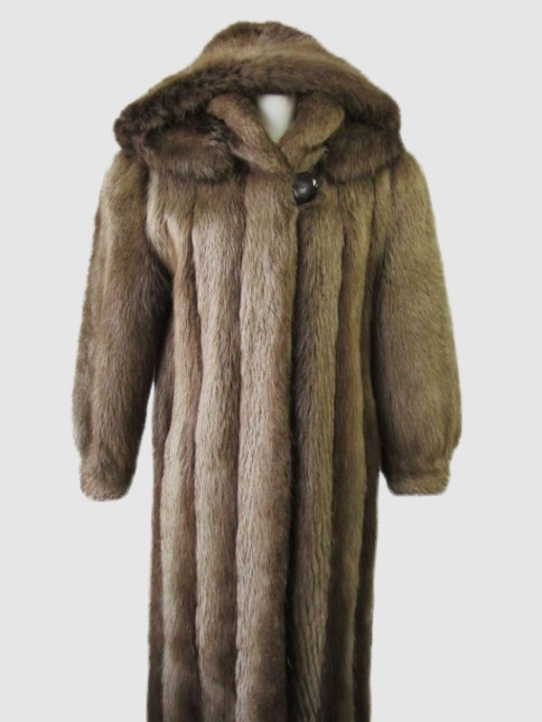 Superbly Soft and lightweight green sheared muskrat fur coat for ladies. Shawl style fur collar, side slit pockets, durable furrier / button closures and satin lining complete the look of this beautiful muskrat fur coat. Fur and lining in excellent condition. Cleaned and glazed.