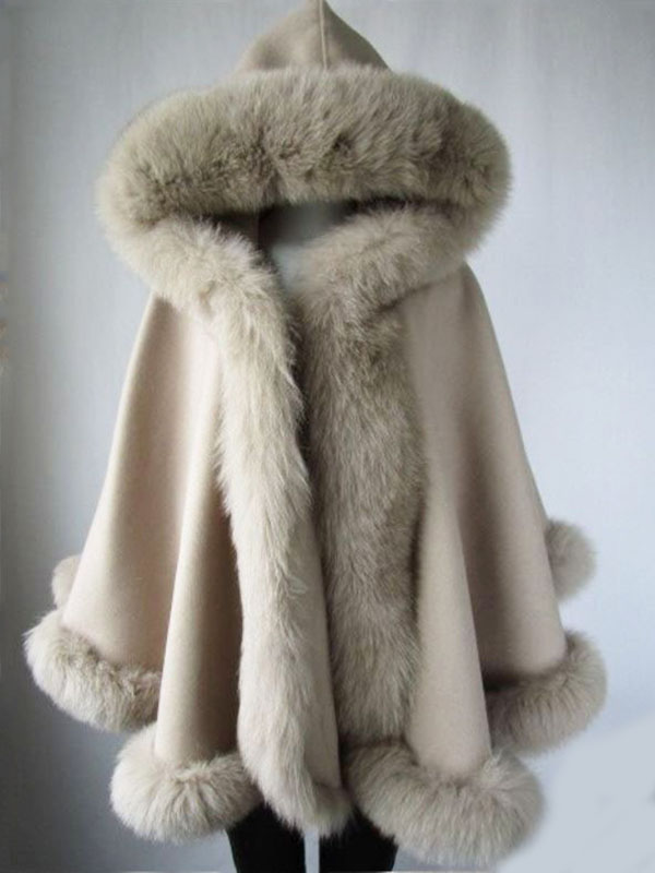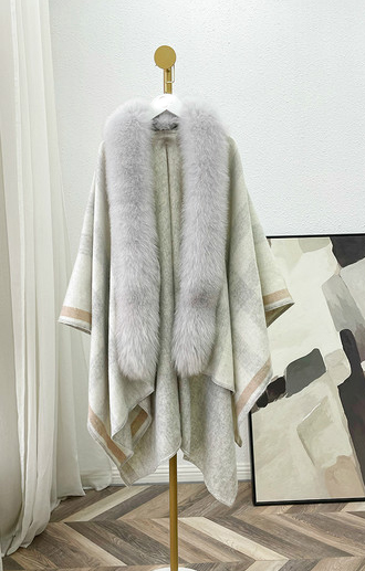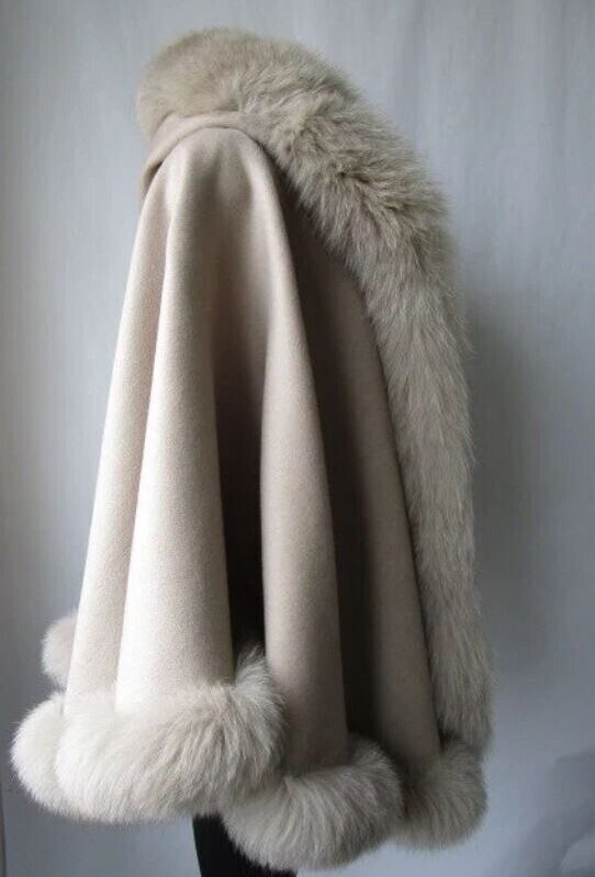Women's Oatmeal Beige Cashmere Wool Wrap Cape with Fox Fur with HOOD