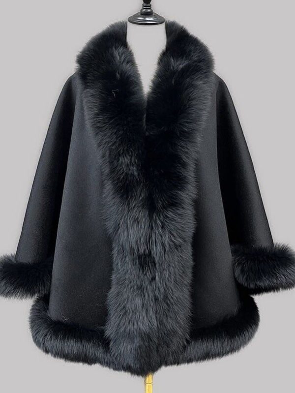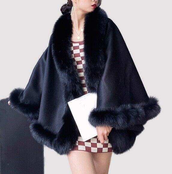 Women's Black Cashmere Wool Wrap Cape Fox Fur Trim