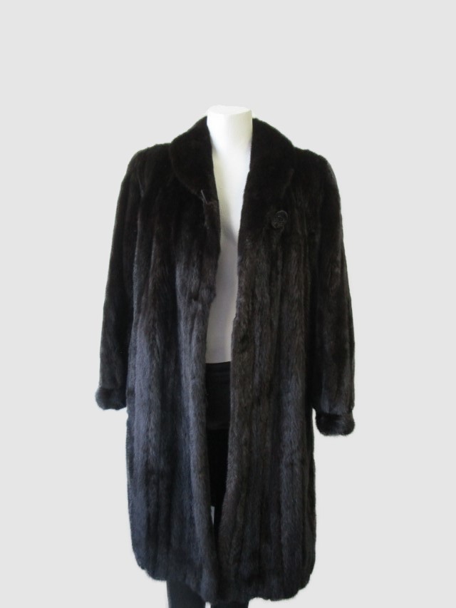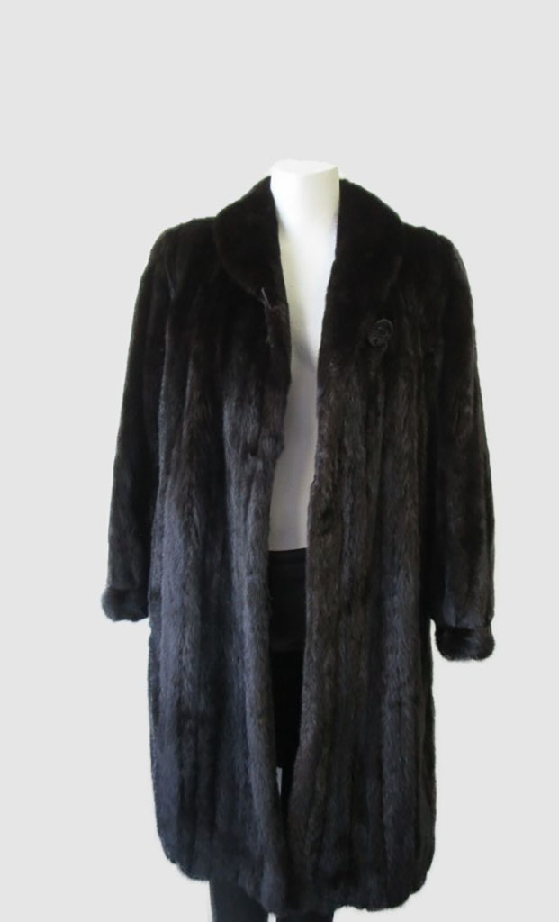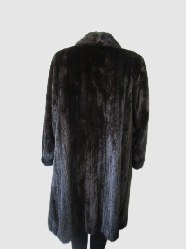 Luxurious natural dark ranch FEMALE mink fur coat for ladies. Top quality full and super soft female mink fur pelts, shawl style fur collar, side slit pockets, front furrier closures, and satin lining complete the look of this elegant fur coat. Fur and lining in excellent condition.
