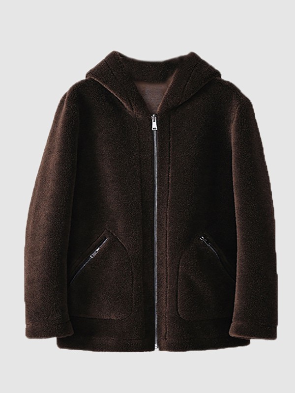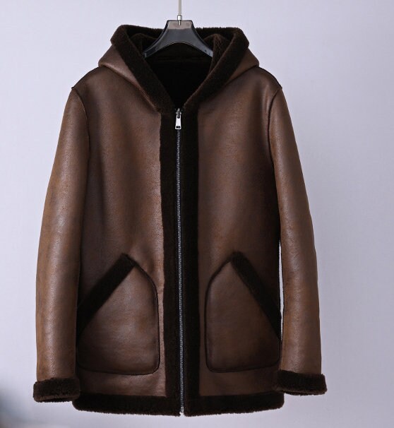 Men's 100% Wool Brown Sheepskin Lamb Coat Jacket Parka with Hood REVERSIBLE