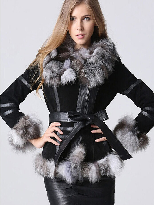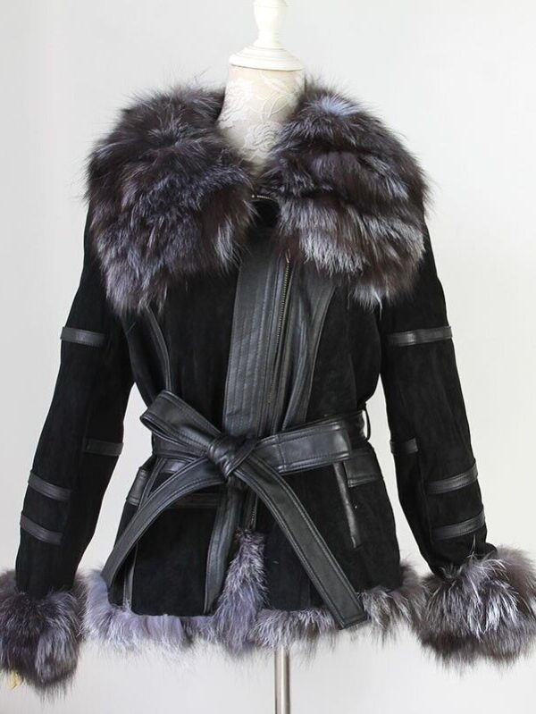Women's Black Suede Leather Silver Fox Fur Jacket Coat