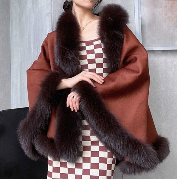 Women's Cinnamon Brown Cashmere Wool Wrap Cape Fox Fur