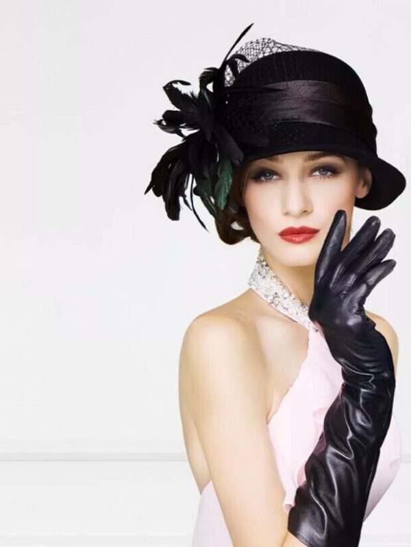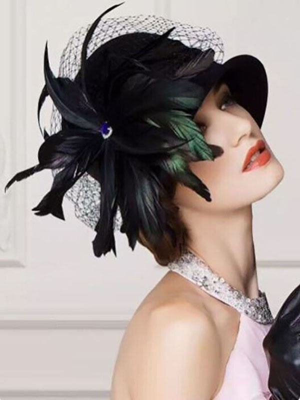 Women's Gorgeous Black Wool Hat Wedding Feathers Rhinestones Tulle